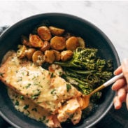 Delicious baked salmon with crispy potatoes, broccoli, and the most amazing life-changing lemon sauce smothered on top of it all. This is restaurant bistro-style eating!