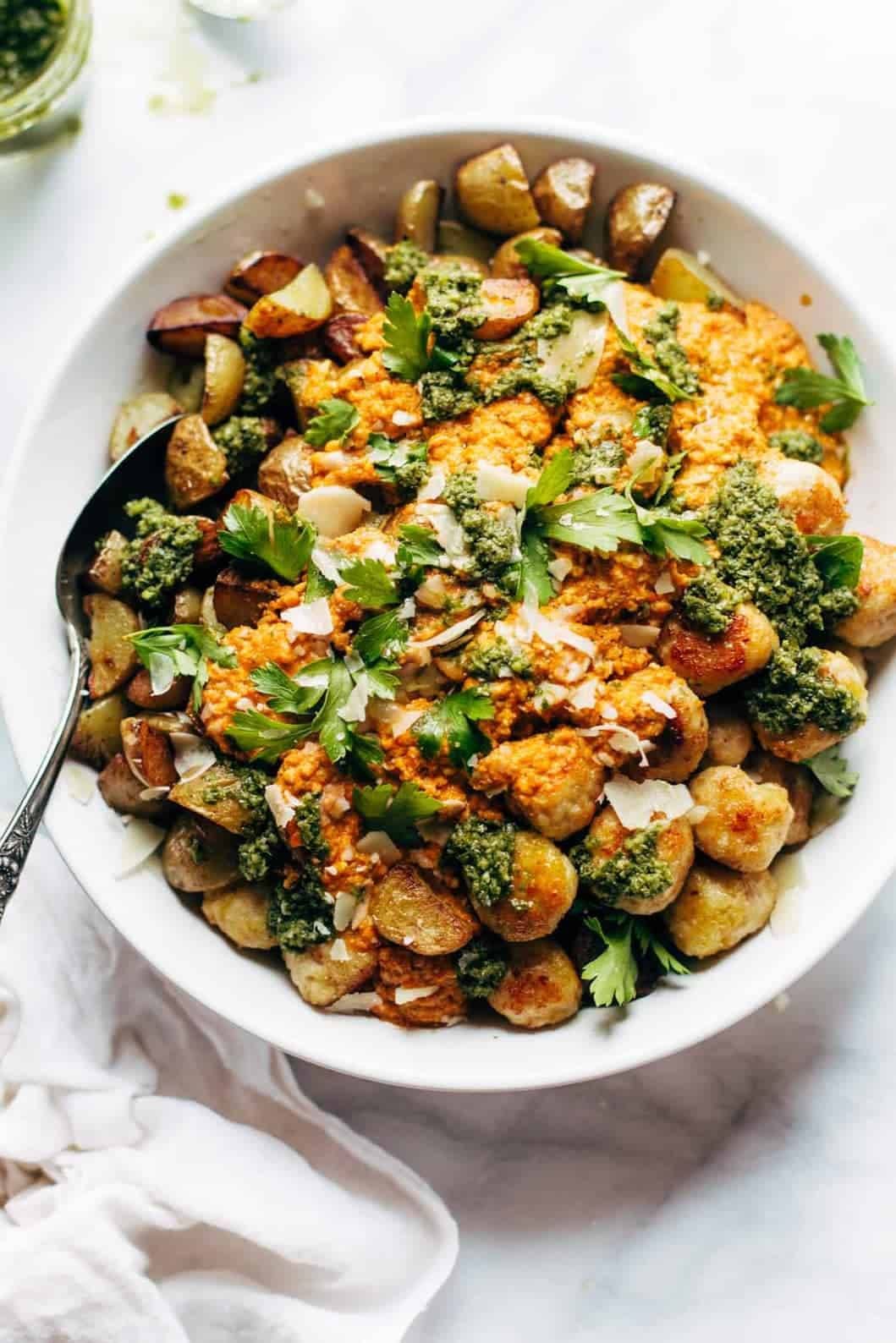 Mini Chicken Meatballs with Crispy Potatoes and Romesco
