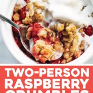 The BEST easy summer dessert – for two! A layer of oat-brown-sugar crust, juicy, sticky, bubbly raspberries, and topped with a buttery crumble that’s baked to perfection.